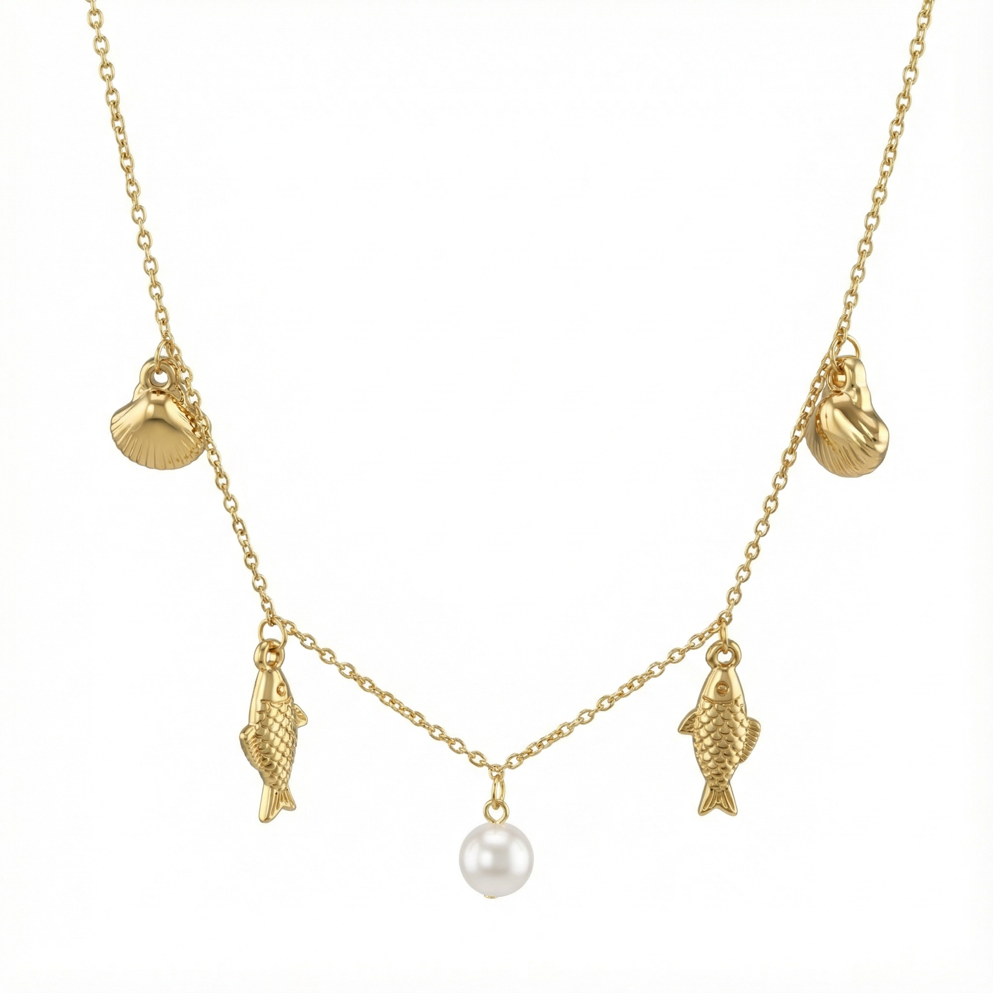 Collier perles et breloques coquillages en acier inoxydable doré
