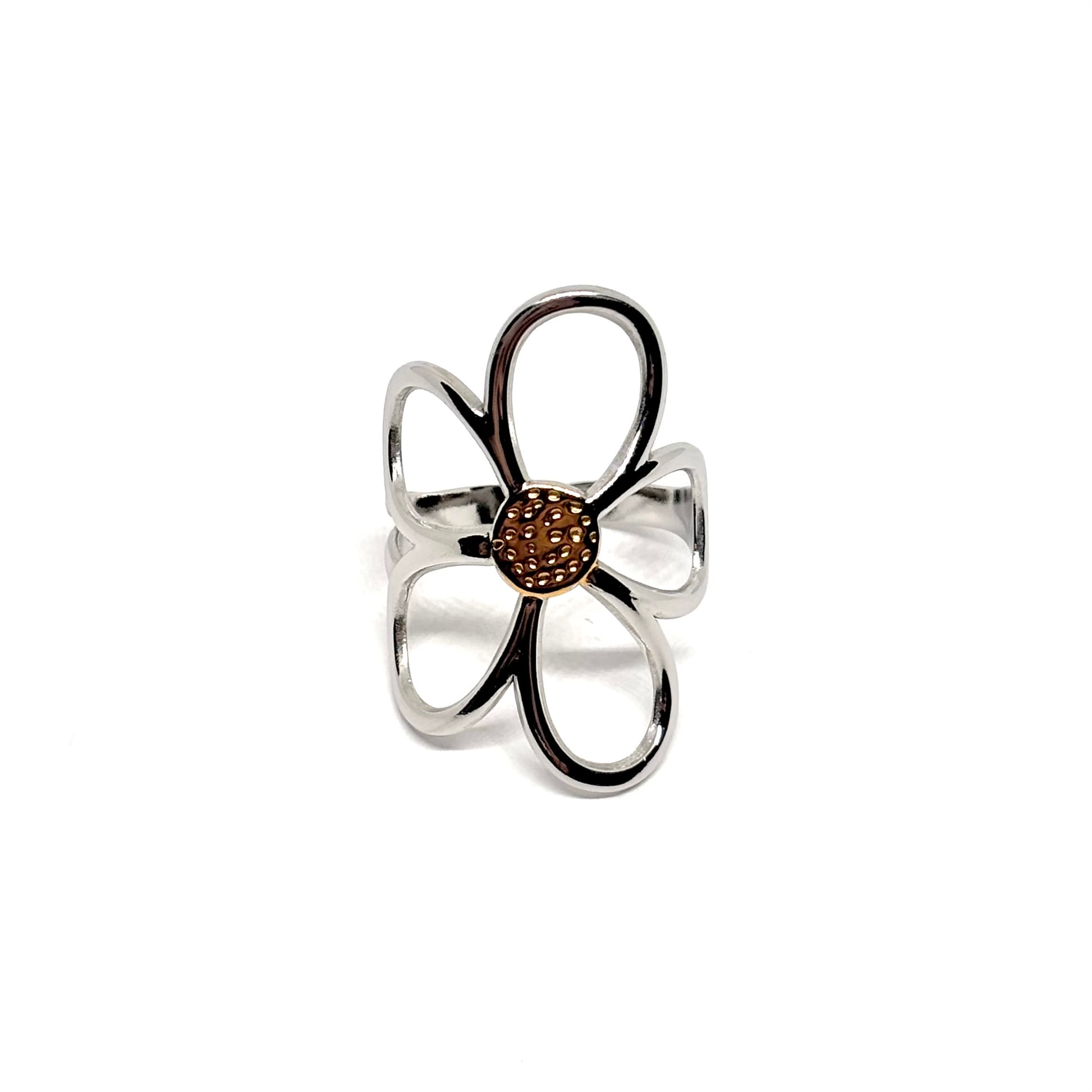 Affirmez votre style avec cette bague fleur en acier inoxydable, au design ajouré et moderne. Son centre doré texturé contraste avec les pétales argentés, pour une touche de fraîcheur raffinée.
