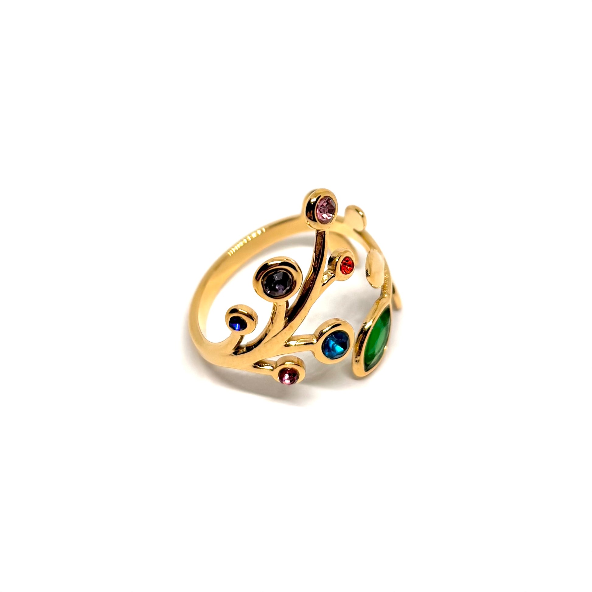 Bague fine couleur doré, inspirée d'une branche florale, ornée de cristaux multicolores éclatants. Ouverte et ajustable, elle épouse le doigt avec légèreté et élégance.