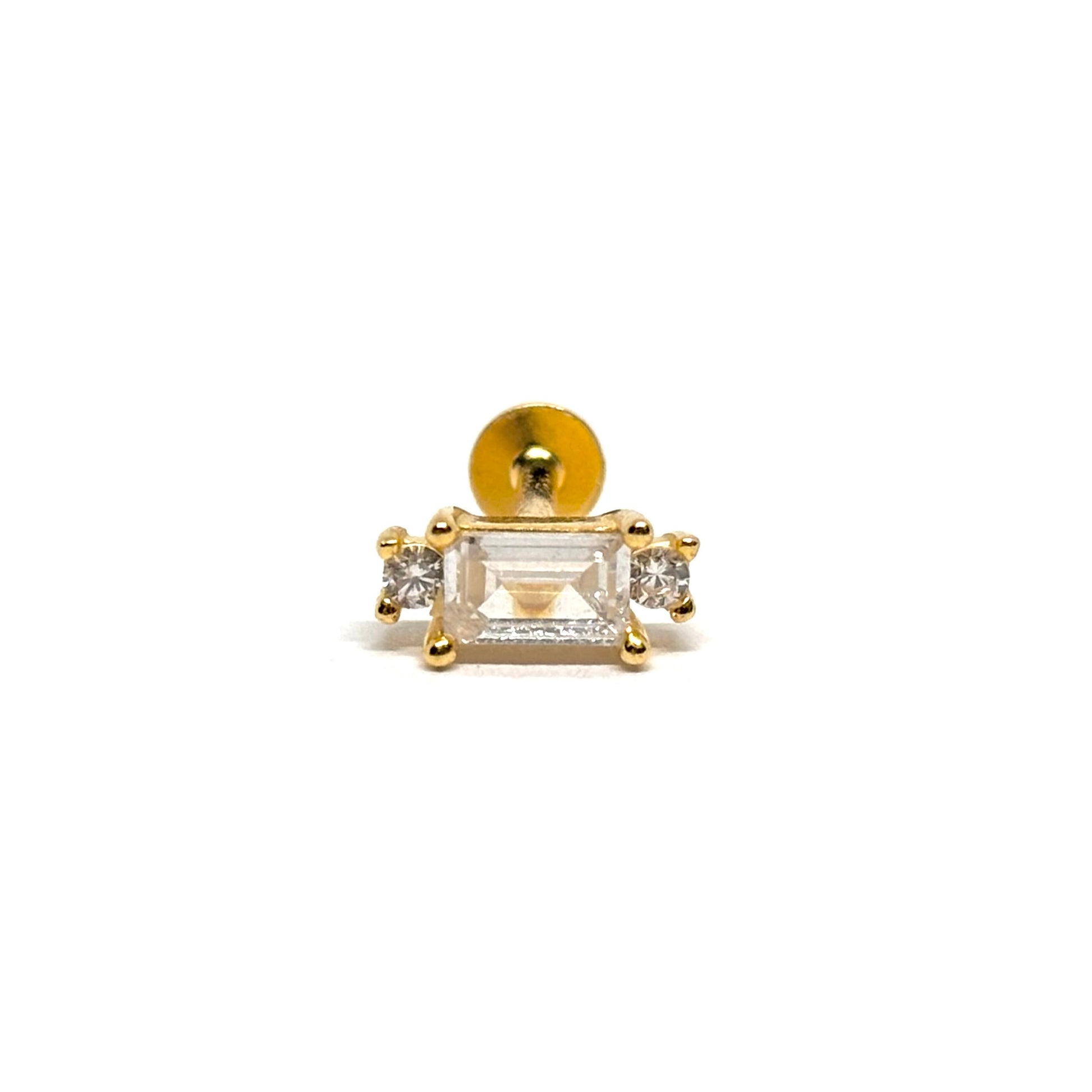 Ce bijou se distingue par son zircon central rectangulaire taille émeraude, encadré de deux zircons ronds scintillants. Un bijou chic et minimaliste qui capte parfaitement la lumière, pour un éclat discret mais sophistiqué.